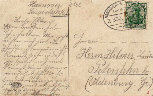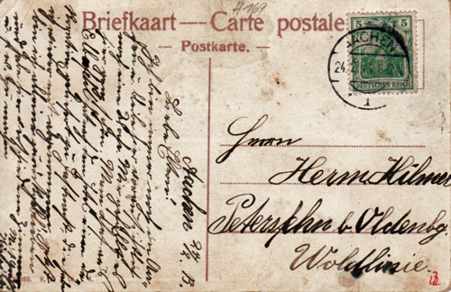 ![]() ![]() Nr. 157: 25.9.10 Liebe Eltern! Ich gehe morgen von Hildesheim weg, denn ich kann hier augenblicklich keine Arbeit bekommen. Ich schicke Euch ein Paket mit allem was ich jetzt gerade nicht brauche, damit ich nicht soviel zu schleppen habe. Ferner schicke ich Euch noch 50 M, denn die Arbeit geht überall mächtig .... Wenn ich wieder Arbeit habe, schicke ich Euch mehr. Hiervon soll Mutter aber die 5 M., die es mir ... gleich zurückbehalten. ![]() ![]() ![]() ![]() ![]() ![]() ![]() ![]() ![]() ![]() ![]() ![]() ![]() ![]() ![]() ![]() ![]() ![]() ![]() ![]() ![]() ![]() Nr. 169: Aachen, 24.2.1913, Liebe Eltern! Ich bin immer noch in Aachen und bleibe voraussichtlich noch eine Woche. Mir gefällt es hier ganz schön. (...) ![]() ![]() ![]() ![]() ![]() ![]() ![]() Nr. 173: 18.8.1913, Geburtstagsgruß aus Frankfurt an seinen Bruder Gerhard (geb. 21.8.) |